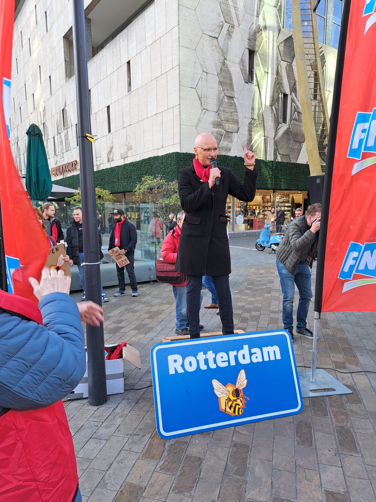 Lokaal FNV Rotterdam heeft alle nieuw gekozen leden van de gemeenteraad een 10-puntenplan aangeboden met een feestelijke traktatie op de trappen van het stadhuis aan de Coolsingel.