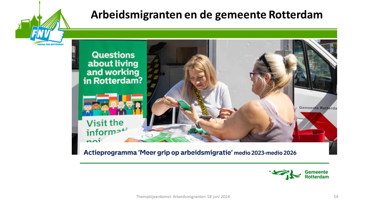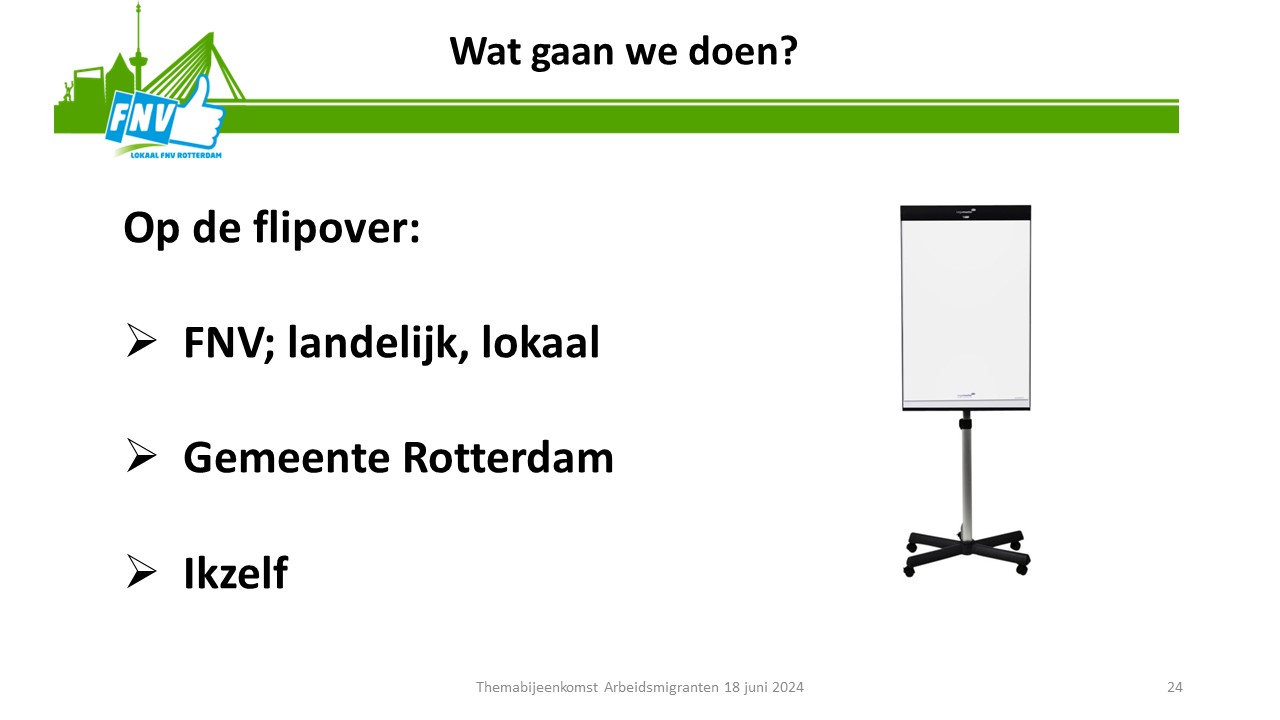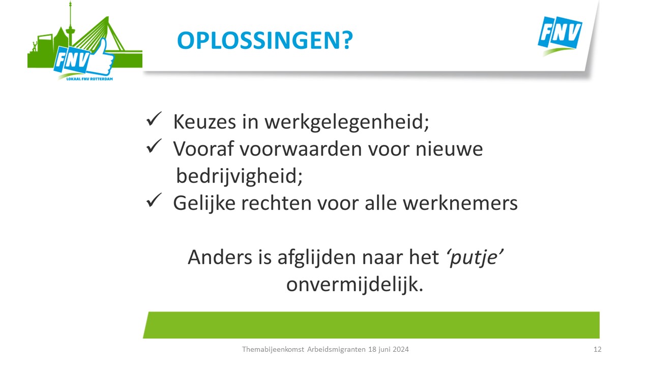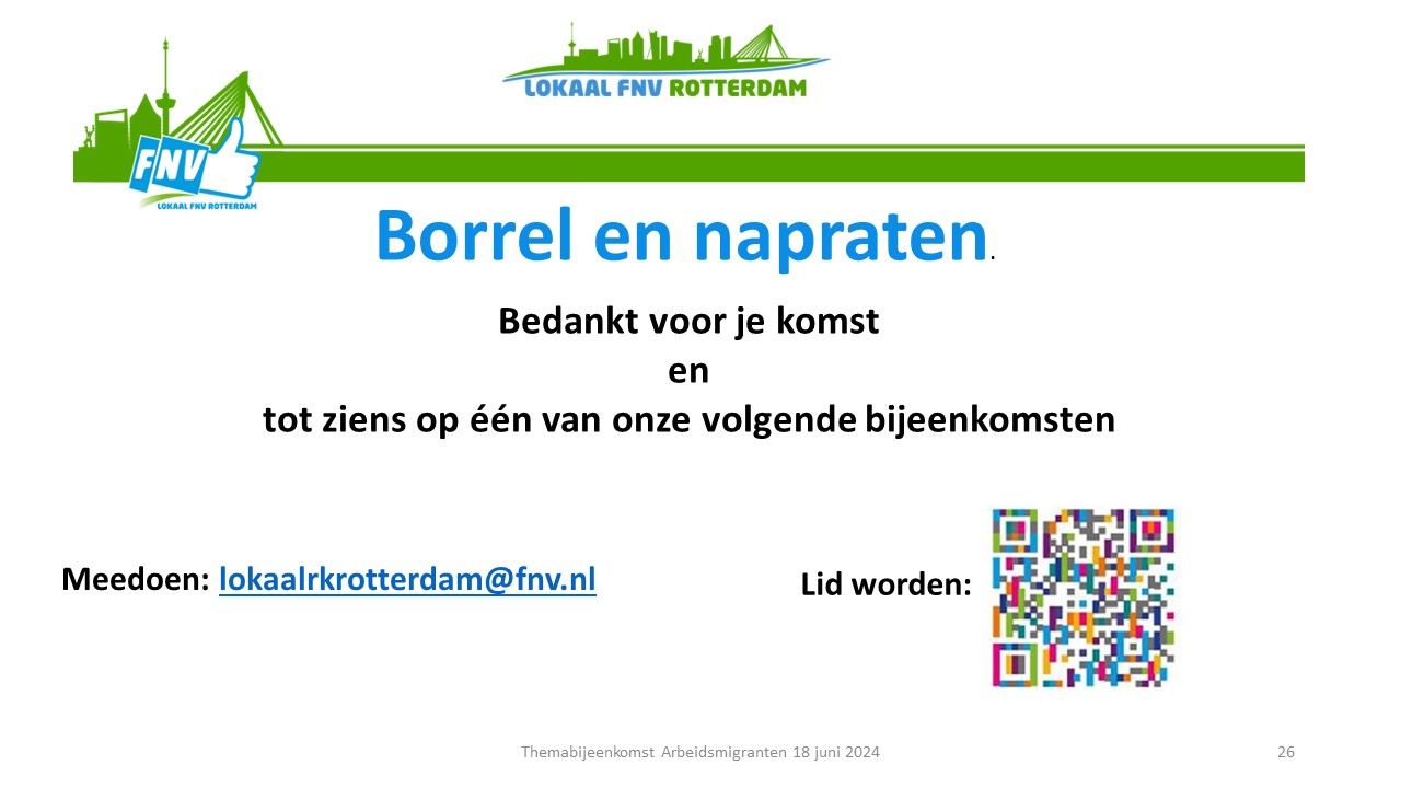 Tenslotte werd de oproep gedaan om met deze ideeën aan de slag de gaan. Daar moesten de aanwezigen nog even over nadenken. Aanmelden hiervoor kan via het emailadres: lokaalrkrotterdam@fnv.nl ovv arbeidsmigranten.