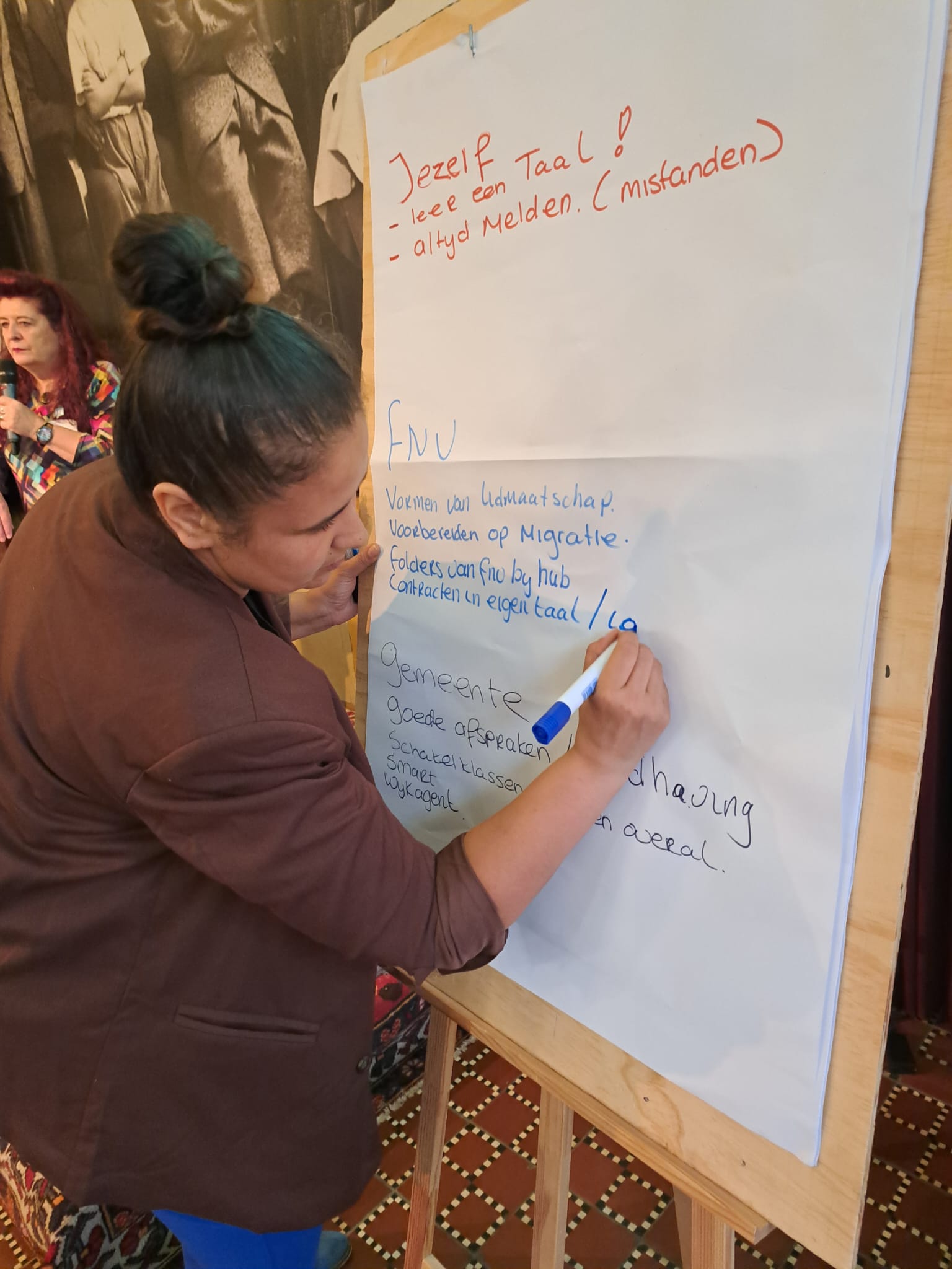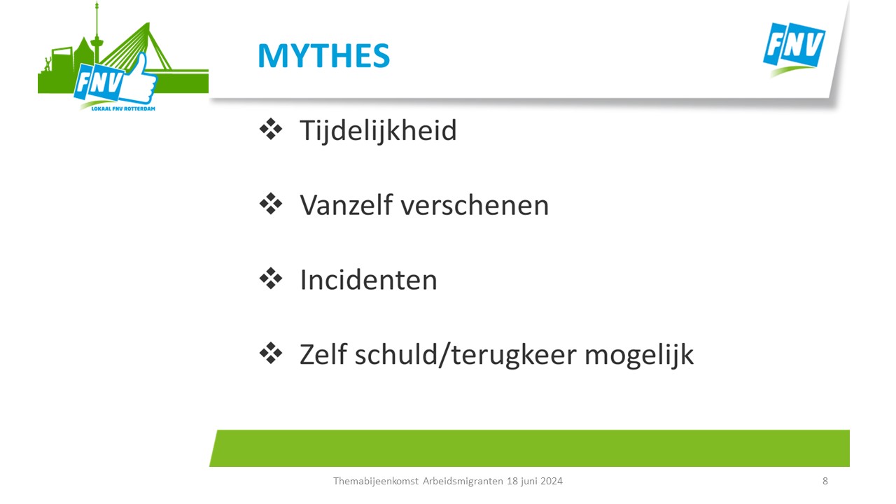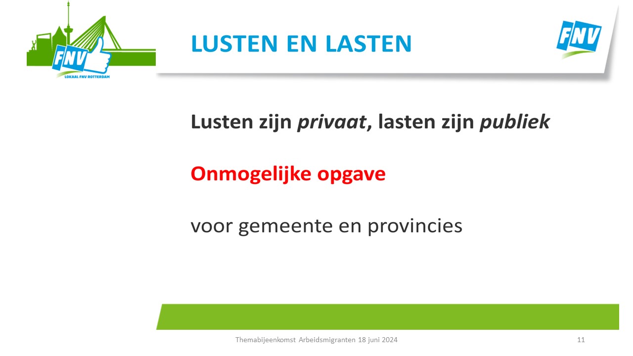 Tenslotte werd de oproep gedaan om met deze ideeën aan de slag de gaan. Daar moesten de aanwezigen nog even over nadenken. Aanmelden hiervoor kan via het emailadres: lokaalrkrotterdam@fnv.nl ovv arbeidsmigranten.