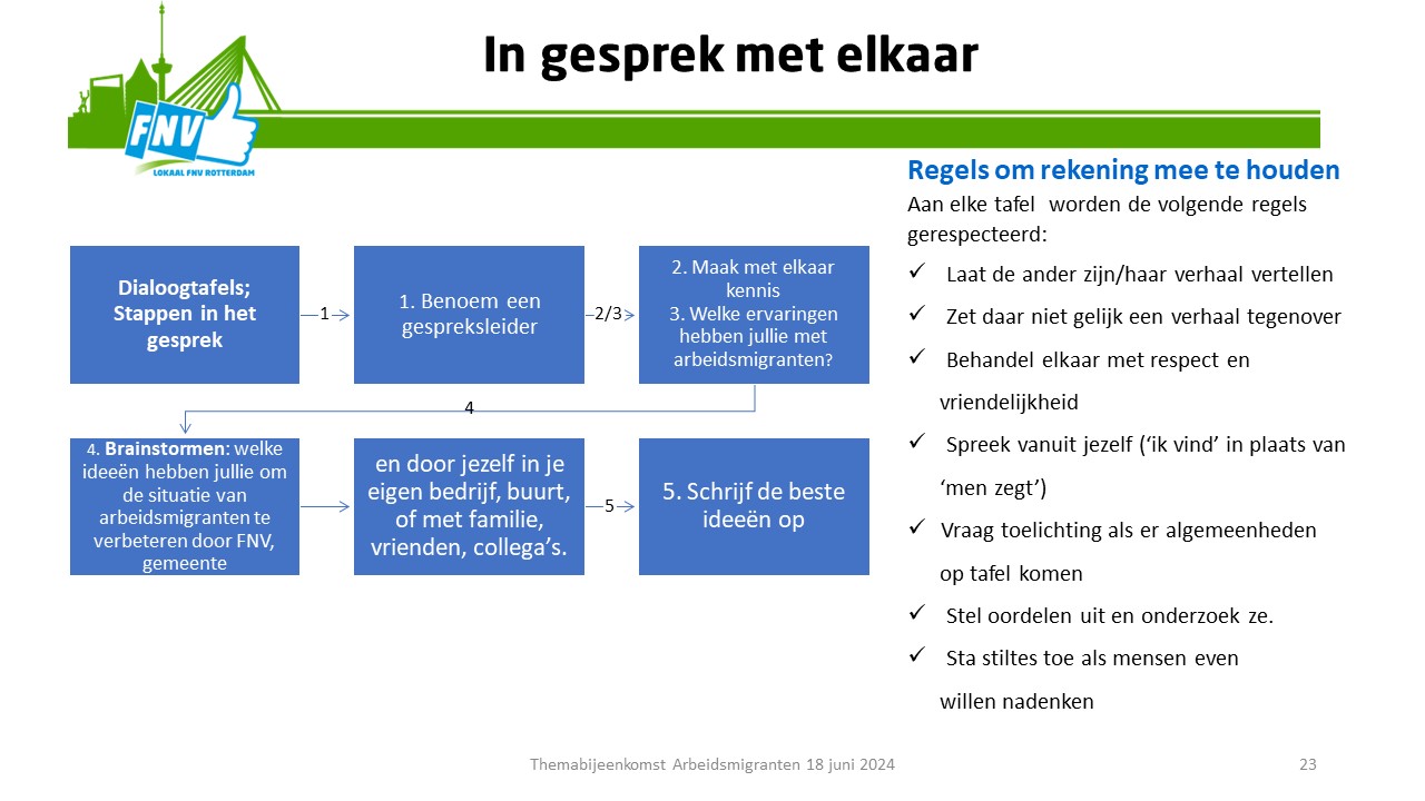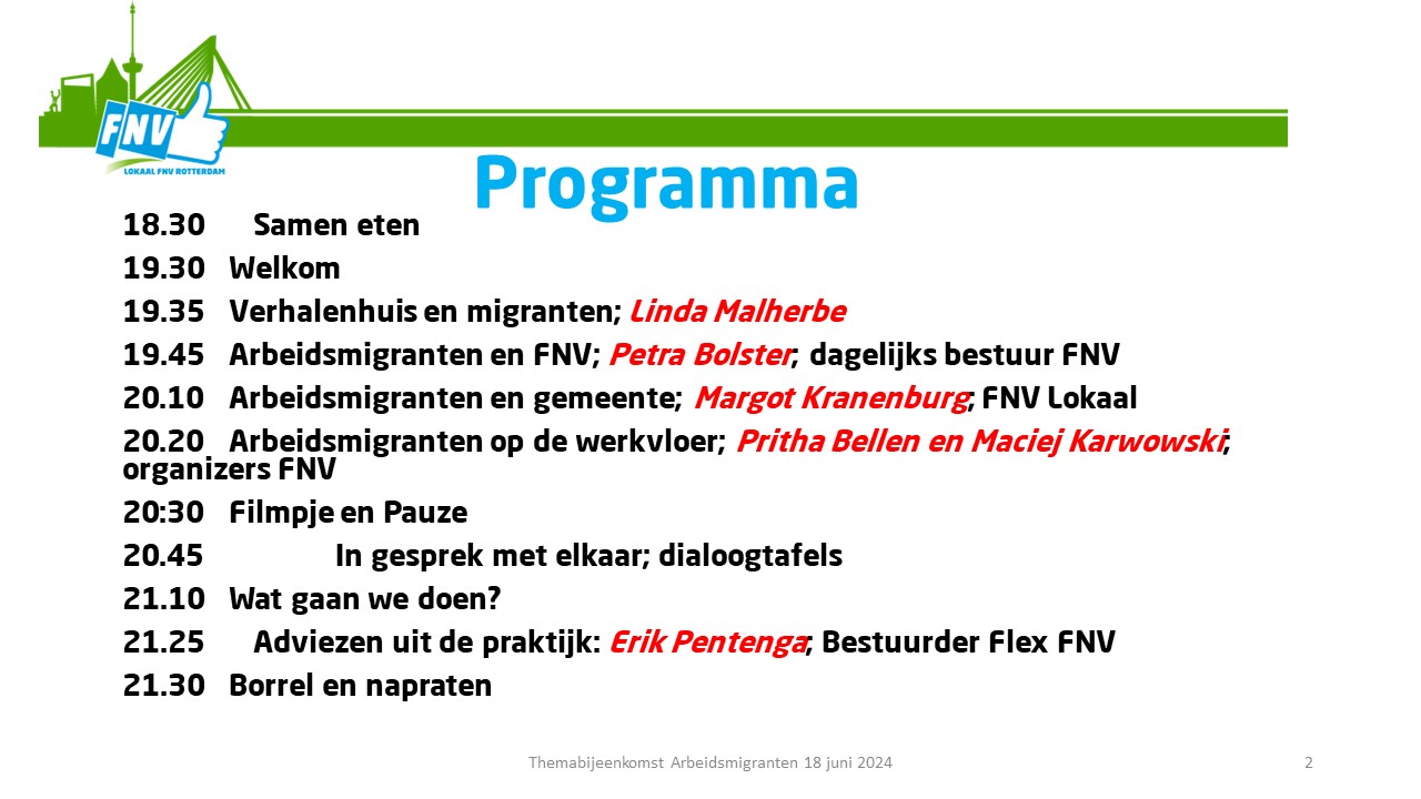 De bijeenkomst begon met een gezamenlijke maaltijd om 18:00 uur. Het programma startte om 19:30 uur met een presentatie van Petra Bolster, die de FNV-invalshoek weer gaf. Erik Pentenga beantwoordde vragen uit het publiek. Vervolgens werd het actieprogramma van de gemeente Rotterdam, ‘meer grip op arbeidsmigratie’ toegelicht. Helaas kon er niemand van de gemeente aanwezig zijn in verband met een werkbezoek aan Polen. Het programma werd vervolgd met dialoogtafels over mogelijke verbeteringen in het beleid en wat je zelf hierin kan doen. Hierbij kwamen de volgende ideeën naar voren: