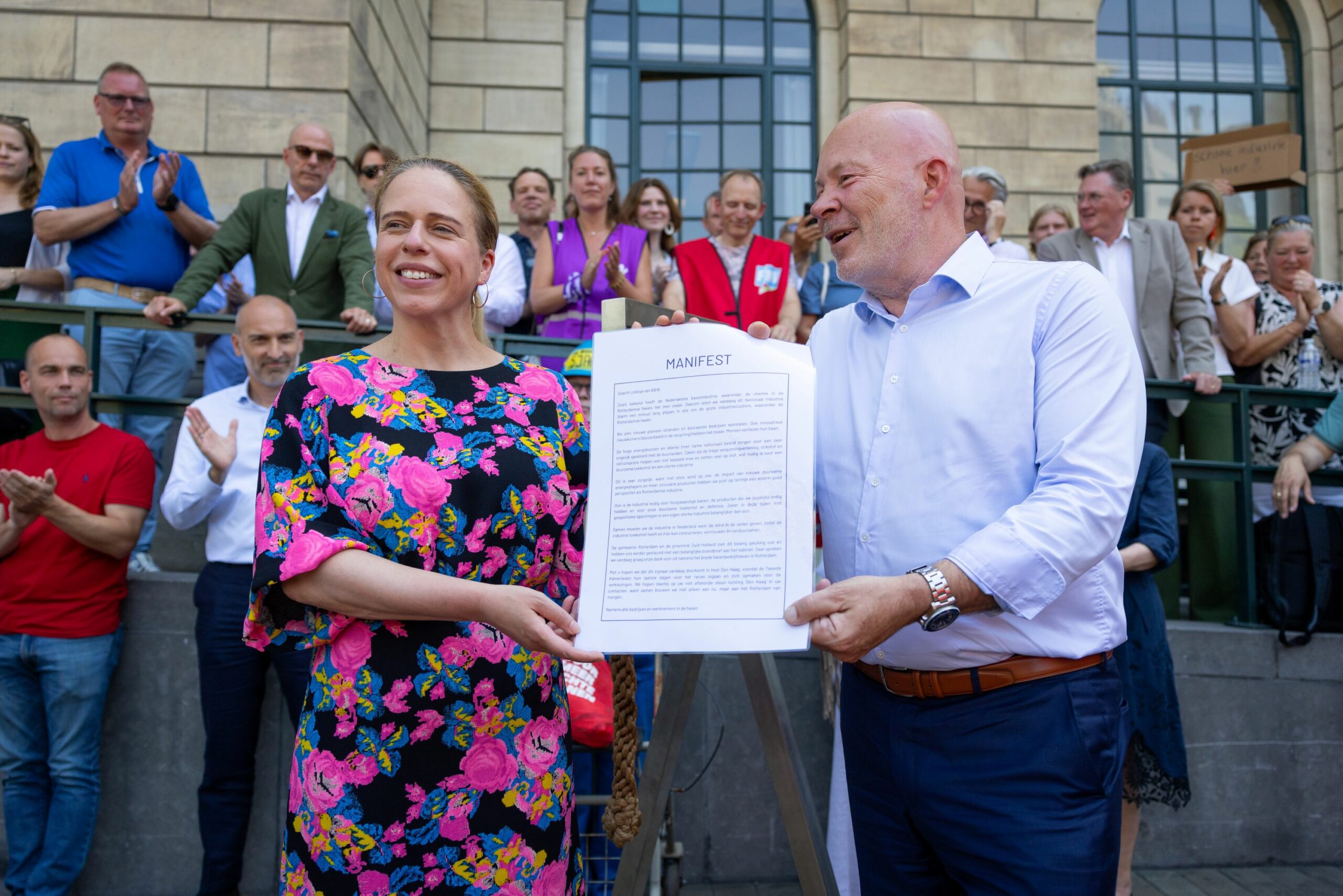 Met deze actie wil Rotterdam opnieuw aandacht vragen voor de urgente situatie in de haven en het feit dat Nederland ander beleid voert dan onze buurlanden met o.a. veel hogere energiekosten. Samen met burgemeester Carola Schouten nam Simons een pamflet in ontvangst uit handen van Deltalinqs-directeur Bas Janssen, namens de bedrijven in de haven.