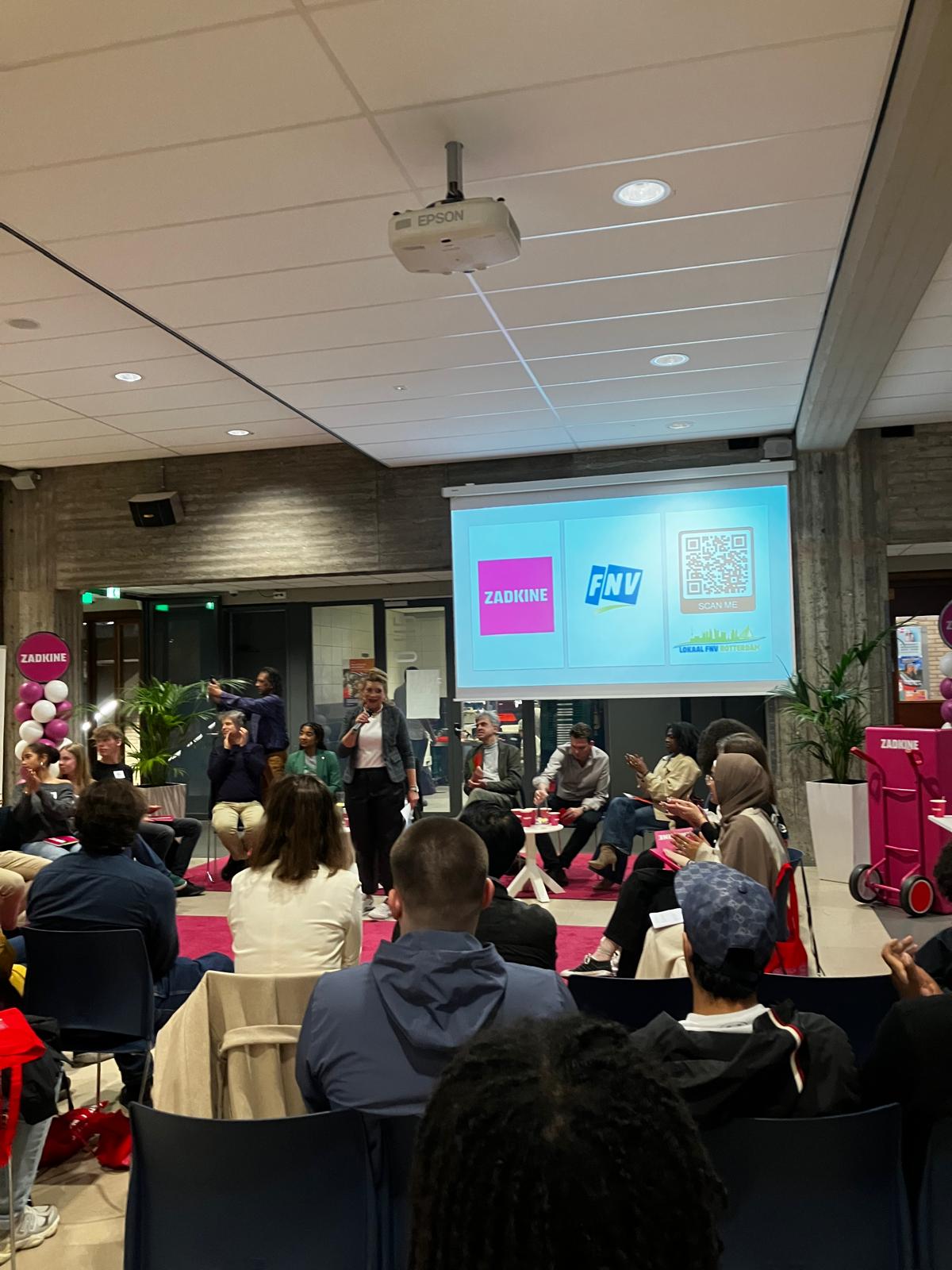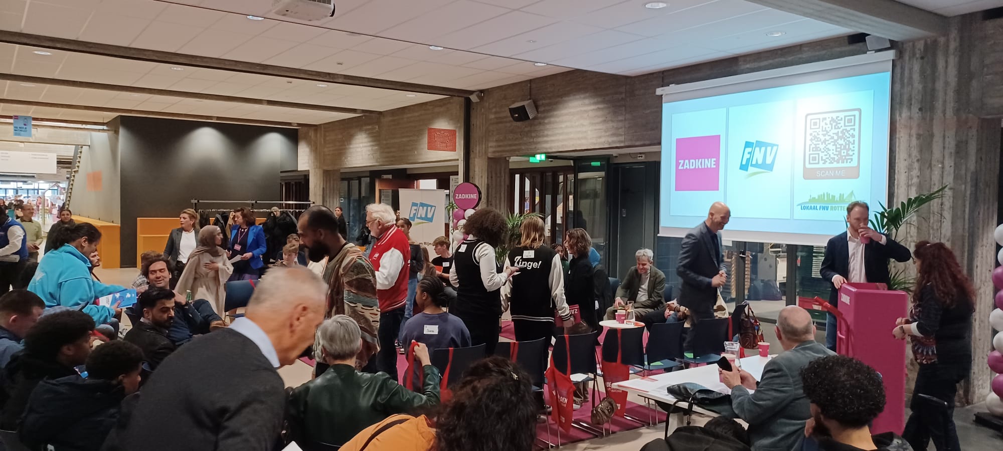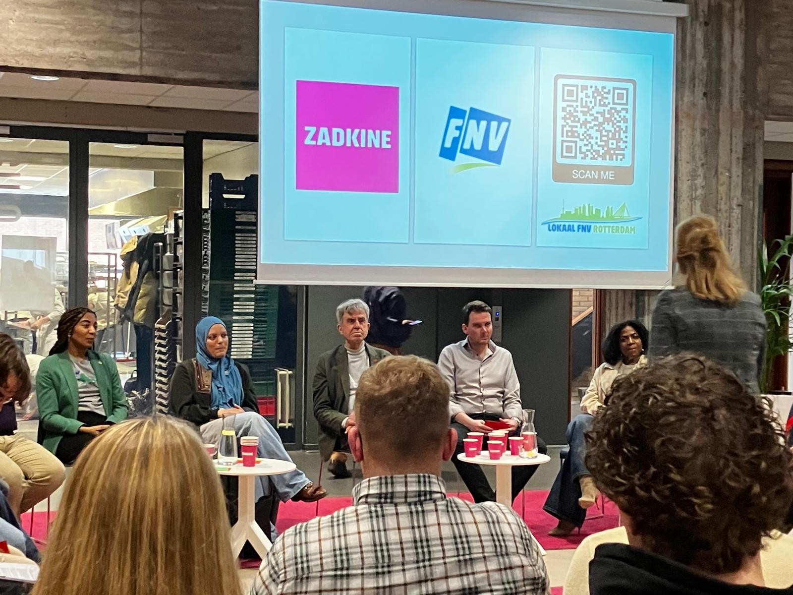 Rotterdamse politieke partijen waren uitgenodigd om deel te nemen aan het politieke debat met Zadkine-studenten over het 10-puntenplan van de FNV Rotterdam.