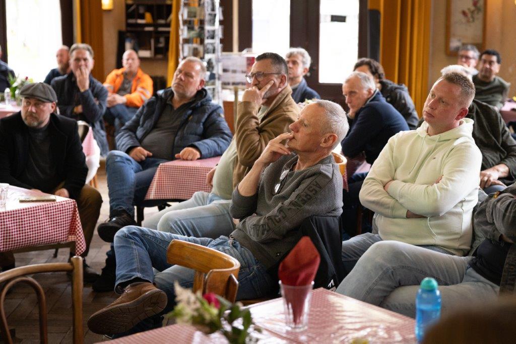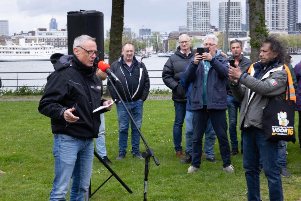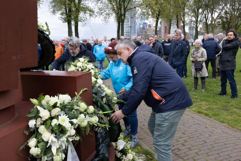 Maar het was uiteraard Workers Memorial Day en dus was er ook aandacht voor de minder leuke aanleiding tot deze bijeenkomst. Misja de Vos, zelf havenarbeider, legde uit dat lang niet alles in de haven geautomatiseerd is en dat werkzaamheden zoals die van de sjorders nog steeds grote risico’s met zich meebrengen. Margot Kranenburg van het Algemeen bestuur FNV wees er daarna op dat het herdenken verder gaat dan omgekomen havenarbeiders. We denken dan ook aan mensen die lijden aan Long Covid en ziekten zoals kanker, opgelopen als gevolg van het omgaan met schadelijke stoffen.