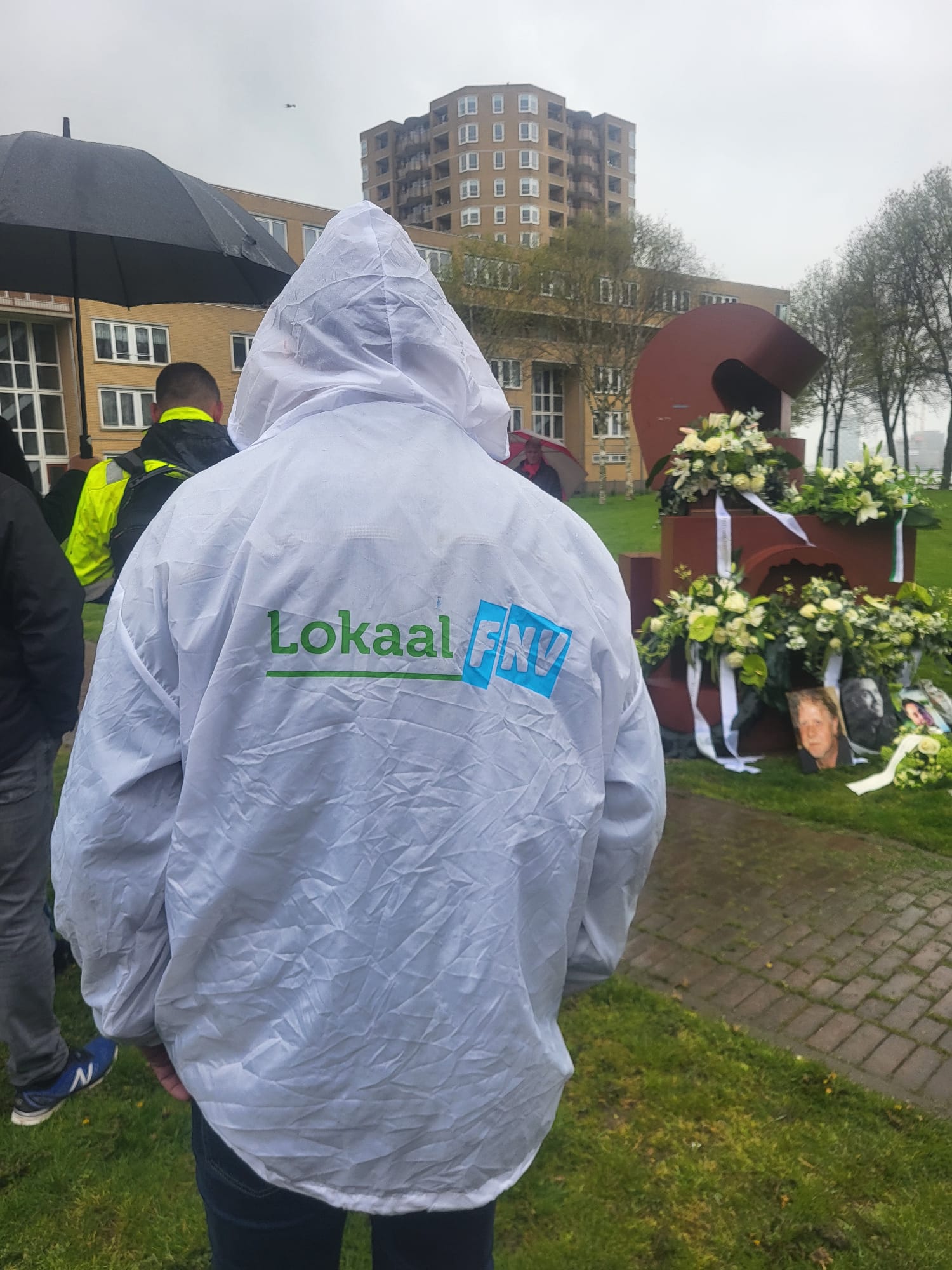 En zo werden vertegenwoordigers van de FNV Havens maar ook van de FNV Bouw, FNV Uitkeringsgerechtigden, FNV Senioren en FNV lokaal Rotterdam, uitgenodigd om, vooraf aan de herdenking, in het verhalenhuis te genieten van heerlijke soep en geschiedenisles. Linda Malherbe, mede-initiatiefneemster en bedrijfsleider van Verhalenhuis Belvédère, diste smakelijke verhalen op over de historie van het pand. In de 2e wereldoorlog was het een vrijplaats was voor allerlei illegale praktijken zoals verboden jazz concerten; Katendrecht was toen immers een hoerengebied en het was voor Duitsers verboden daar rond te lopen. Hans Abelman vertelde de ontstaansgeschiedenis van het monument en Margot Kranenburg van het Algemeen bestuur FNV legde uit wat Workers Memorial Day precies inhoudt. Daarna werd, in een toepasselijke druilregen, door vertegenwoordigers van FNV havens bloemen en een krans gelegd en werd er stilgestaan bij collega’s die het afgelopen jaar omkwamen bij de uitoefening van hun werk.